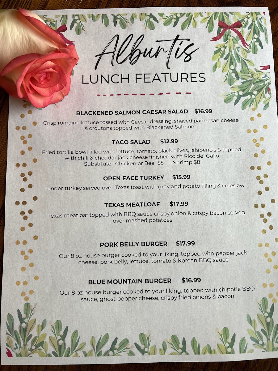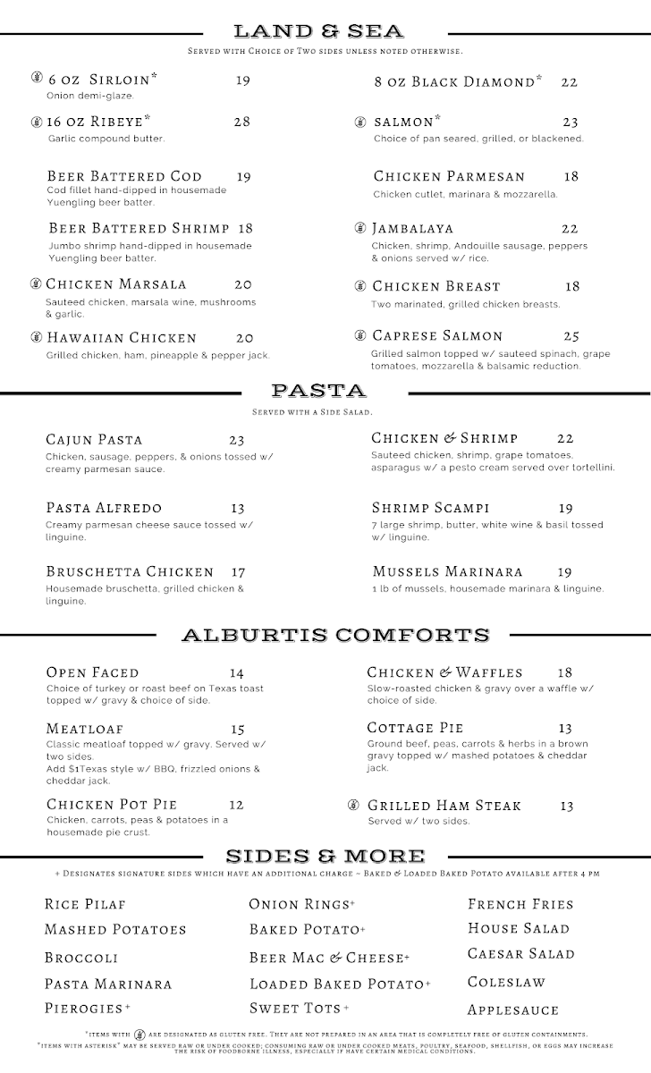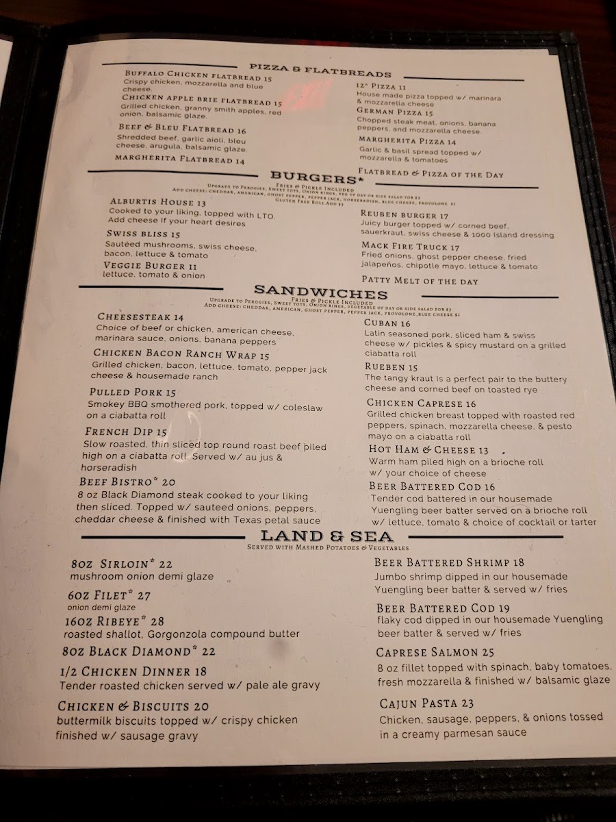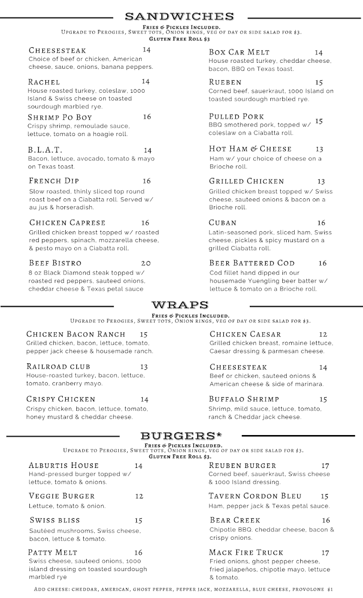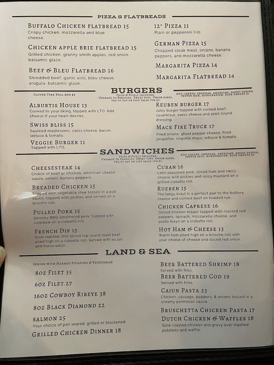 Nestled in the heart of Alburtis, Alburtis Tavern is a cozy spot where hearty meals and great company come together. The Alburtis Tavern Menu offers a delightful mix of comfort food, perfect for a casual outing or a relaxed dinner with friends. From classic burgers to satisfying sandwiches and savory appetizers, every dish is made with care and designed to please all palates. Whether you're in the mood for something quick or craving a filling, flavorful meal, there’s something here to satisfy your hunger. Pair your meal with a refreshing drink from their well-stocked bar, and enjoy the warm, inviting atmosphere. It's the kind of place where you can unwind, chat with friends, and indulge in delicious food that hits the spot every time.